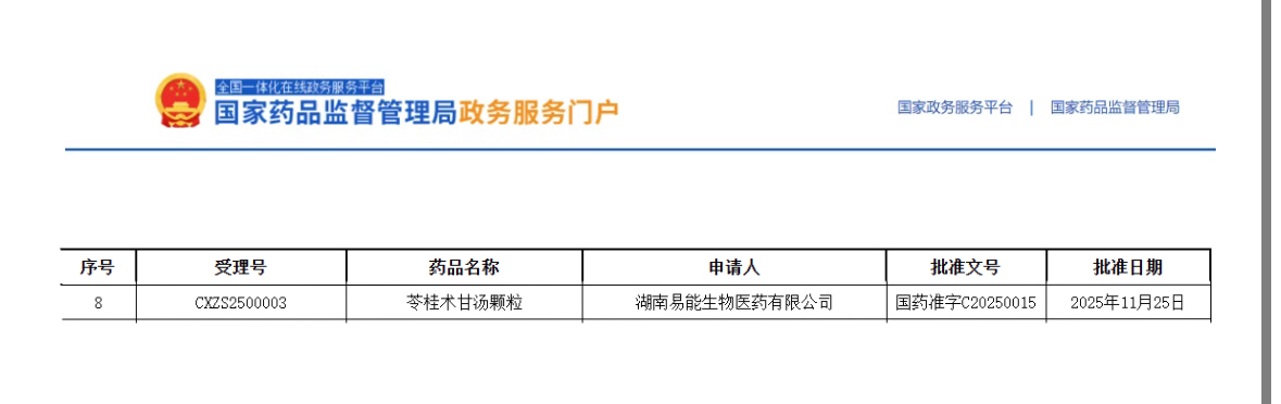 近日,湖南易能生物医药有限公司(下称“易能医药”)收到国家药监局核准签发的苓桂术甘汤颗粒《药品注册证书》,以中药新药3.1类获批上市。该产品的获批不仅标志着企业在中医药传承创新领域实现关键突破,更为中阳不足之痰饮证患者提供了兼具传统疗效与现代便捷性的治疗新选择。
