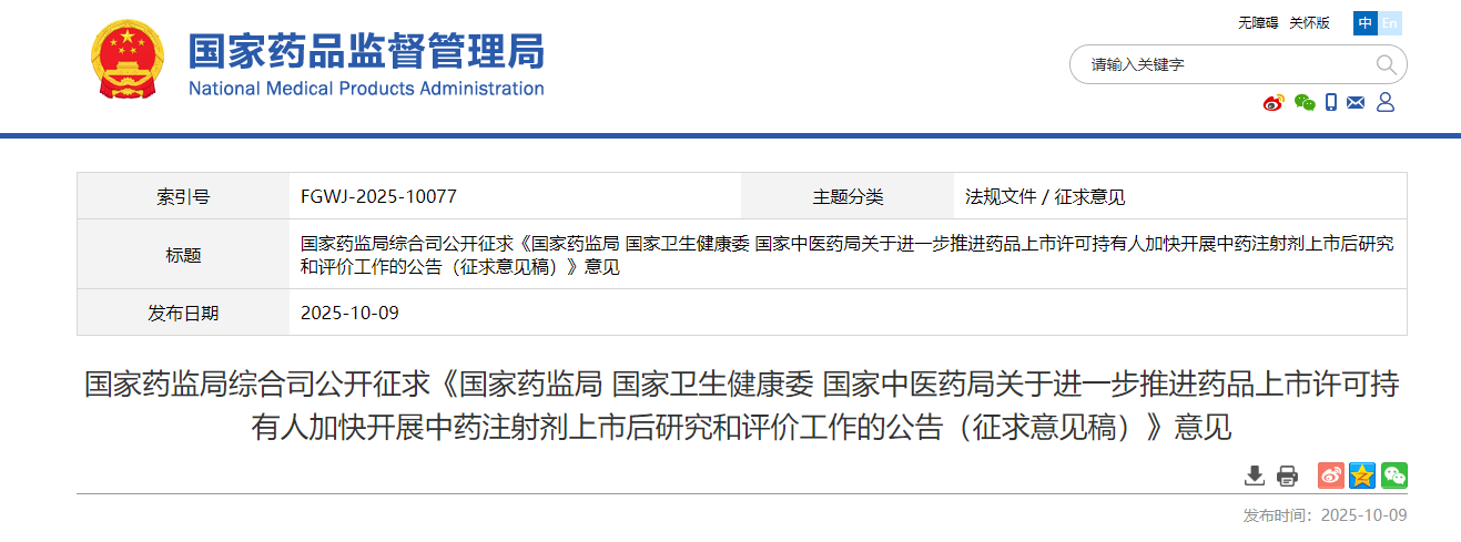 为进一步贯彻落实好《药品管理法》和《国务院办公厅关于全面深化药品医疗器械监管改革 促进医药产业高质量发展的意见》(国办发〔2024〕53号)、《国务院办公厅关于提升中药质量促进中医药产业高质量发展的意见》(国办发〔2025〕11号)等法规和有关政策要求,加快落实推进中药注射剂上市后研究和评价工作。国家药监局在前期开展相关课题研究、反复调研、组织部分中药企业、行业协会、省级药监局、专家等代表座谈论证基础上,起草了《国家药监局 国家卫生健康委 国家中医药局关于进一步推进药品上市许可持有人加快开展中药注射剂上市后研究和评价工作的公告(征求意见稿)》(具体内容及相关起草说明见附件1、2),经会商有关部门同意,现向社会公开征求意见。