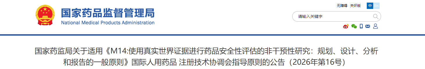 为推动药品注册技术标准与国际接轨,经研究,国家药品监督管理局决定适用《M14:使用真实世界证据进行药品安全性评估的非干预性研究:规划、设计、分析和报告的一般原则》国际人用药品注册技术协调会指导原则(以下简称M14指导原则)。现就有关事项公告如下: