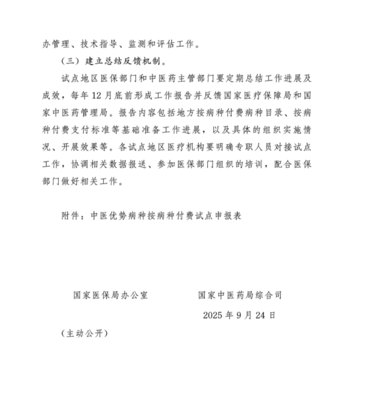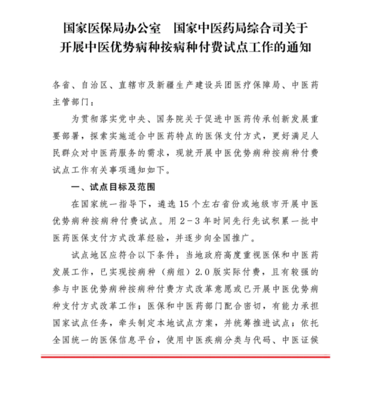 10月9日,国家医保局办公室、国家中医药局综合司联合发布《关于开展中医优势病种按病种付费试点工作的通知》下称“《通知》”,标志着我国正式开启中医医保支付方式改革。