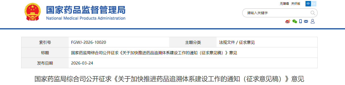 公开征求意见时间2026年3月24日—2026年4月23日。有关单位和个人请将意见建议电子版(附件2)反馈至邮箱ypjgs@nmpa.gov.cn。请在邮件主题注明“国家药监局综合司关于加快推进药品追溯体系建设工作的通知—意见建议反馈”。
