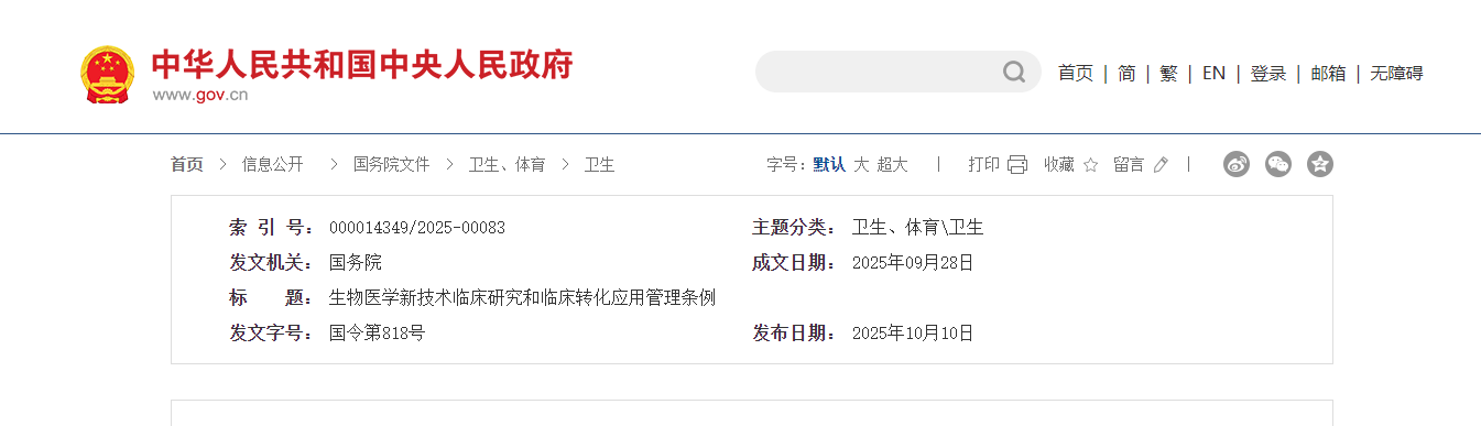 《生物医学新技术临床研究和临床转化应用管理条例》已经2025年9月12日国务院第68次常务会议通过,现予公布,自2026年5月1日起施行。