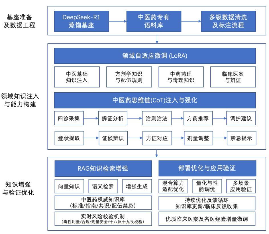 该模型以DeepSeek-R1架构为基础,针对中医药专业场景进行了深度优化与定制开发。通过LoRA微调等先进技术,模型在亿级参数规模上实现了对中医药知识的深度理解与逻辑推理能力。在海量高质量中医药专业数据上进行深度训练,涵盖中药药典标准、经典方剂、临床医案等全场景知识,并且集成了RAG检索增强生成技术,能够高效调用外部的药材技术包与分子生药标准库,构建了覆盖中药复方智能筛选、药效预测、工艺优化、质量控制的全流程智能化平台。