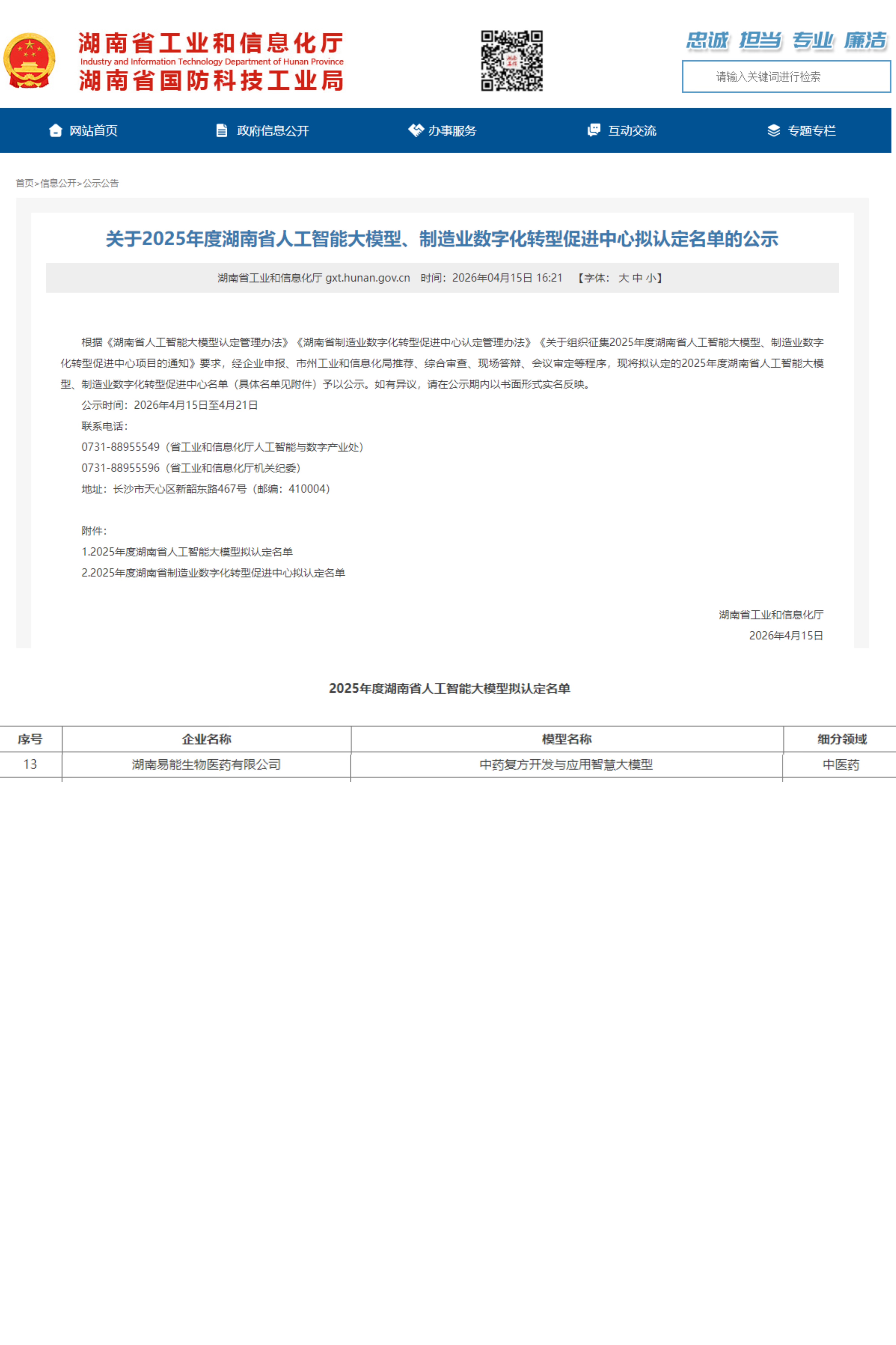 近日,湖南省工业和信息化厅正式公示《2025年度湖南省人工智能大模型拟认定名单》。湖南易能生物医药有限公司(以下简称“易能医药”)自主研发的“中药复方开发与应用智慧大模型”成功入选,标志着易能医药在中医药数智化研发领域的技术实力与创新成果获得省级权威认可。